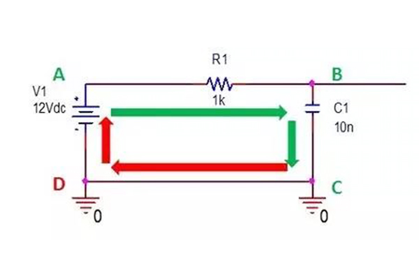 其隐含一个问题就是在PCB上其实V1的负极和C1的负极是有一条线(PCB layout工具软件中用的词比较准确,Trace,踪迹/轨迹)。