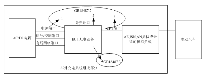 GB/T 18487-2017给出了交直流充电站及其构成相关端口EMC测试方法以及评价标准,充电系统示意图如图3所示,测试负载工况有待机模式和充电模式两种,需测试设备及端口已经在图中标出。其中外壳端口定义为:电磁场可以通过它来辐射或入侵的物理边界。CPT端口指的是传导电能传输端口,包括电能传导并提供相关信号、控制或者通讯功能。