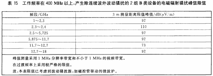 “工作频率在 400 MHz 以上,产生连续骚扰的2组设备的电磁辐射骚扰峰值限值”增加了 11.7 GHz~12.7 GHz 的限值(见 2013 版的表 13);