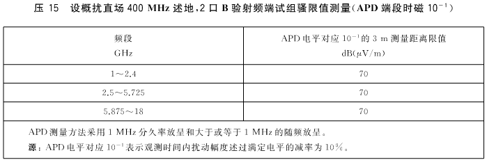 增加了"表 15 工作频率在 400 MHz 以上,2 组 B类电磁辐射骚扰限值(APD水平对应10-1)"(见 2013 版的表15)