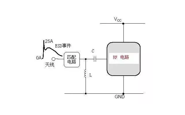 对于射频天线的微波信号,如果用TVS管,压敏等容性器件来做静电防护,射频信号会被衰减,因此要求TVS的电容很低,这样增加ESD措施的成本。对于微波信号可以对地并联一个几十nH的电感来为静电提供一个放电通道,对微波信号几乎没有影响,对于900MHZ和1800MHz的手机经常用22nH的电感。这样能把静电主要能量频谱上的能量吸收掉很多。