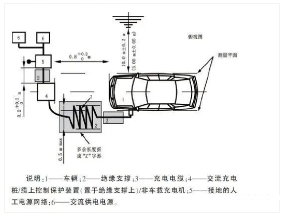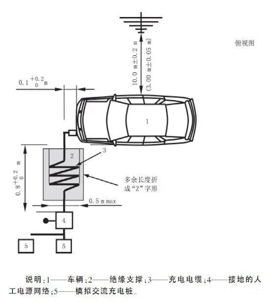 该标准的发射类通用要求为:试验前,车辆可充电储能系统的荷电状态应处在20%~80%之间。交流充电的充电电流应不小于车辆持续最大充电电流值的80%;直流充电的充电电流应不小于20A或车辆持续最大充电电流值的20%,取两者较大值(除非另有规定)。试验时,车辆应静止,发动机(如有)应处于关闭状态。所有与测试功能无关且可由驾驶员或乘员长时关闭的设备应处于关闭状态。试验时,若有需要,可关闭直流充电车辆充电电路的绝缘监测系统。若关闭,宜考虑其它的安全防护措施。该标准划分了测试对象为系统和车辆,测试边界更加明确、责任划分更加明确,例如电磁辐射发射试验布置,如图2和图3所示。有效避免了电动汽车与供电设备组成系统共同作为测试对象时,供电设备对测试结果带来的不确定性,这是与UNR10最大的差异。该标准的布置图详细区分了交直流、车辆接口在车头/车尾或在侧面的布置图,因此实施操作更加细化。