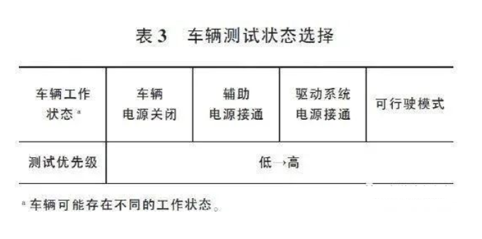 该标准的抗扰类通用要求为:试验前,车辆可充电储能系统的荷电状态应处在20%~80%之间。交流充电的充电电流应不小于车辆持续最大充电电流值的20%;直流充电的充电电流应不小于20A或车辆持续最大充电电流值的20%,取两者较大值。抗扰度测试前,应操作车辆,使车辆驱动系统处于不同工作状态,在所有可能的状态下进行充电功能验证,选择可进行正常充电且优先级较高的状态作为车辆抗扰度测试状态,车辆测试状态选择如表3所示。