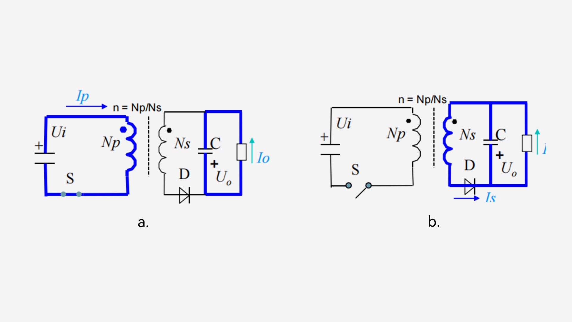 a. 因变压器原、副边相位相反,原边MOS开通时,次级二极管D反向截止,Vin直接作用于原边电感,储存能量。