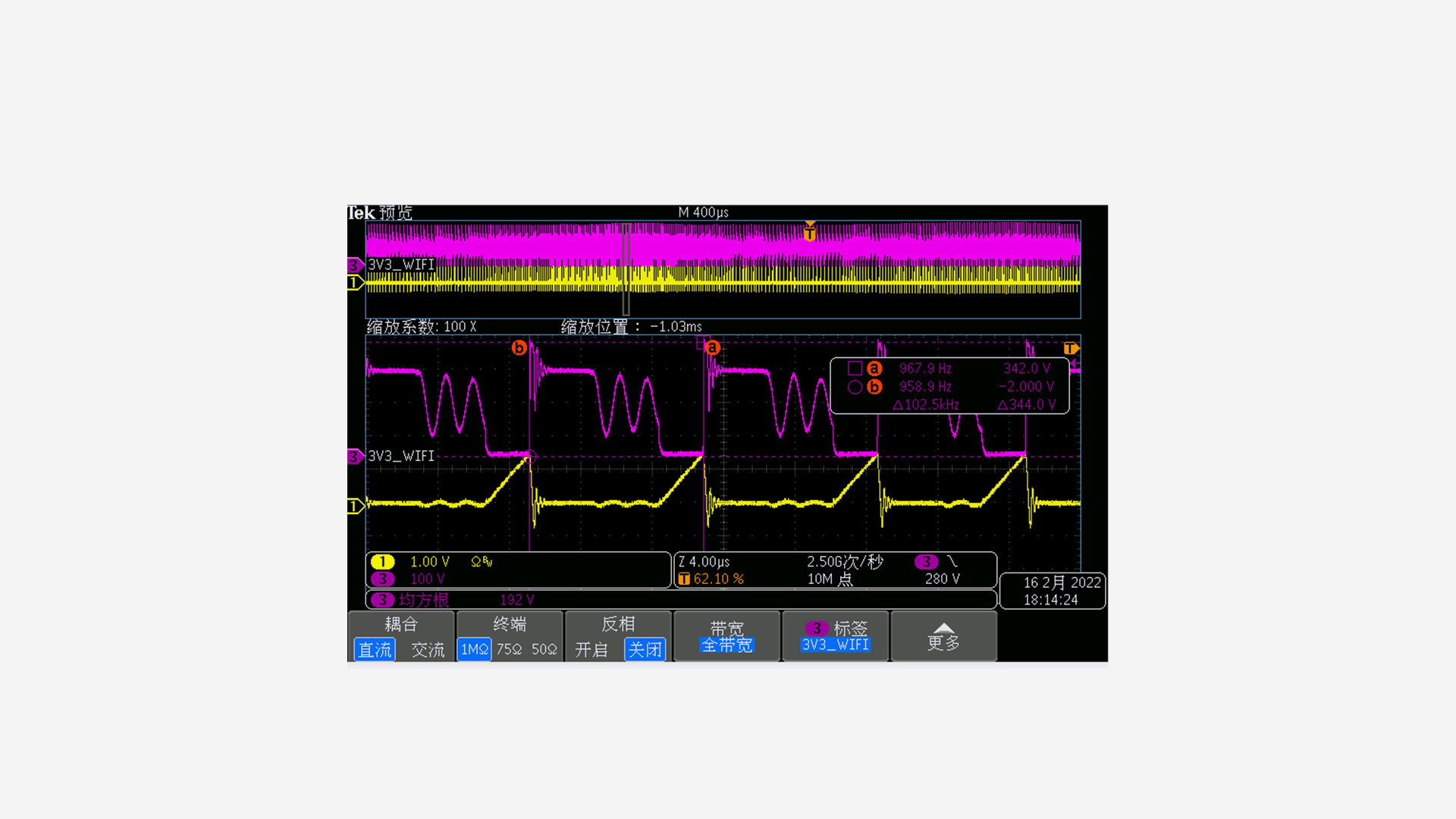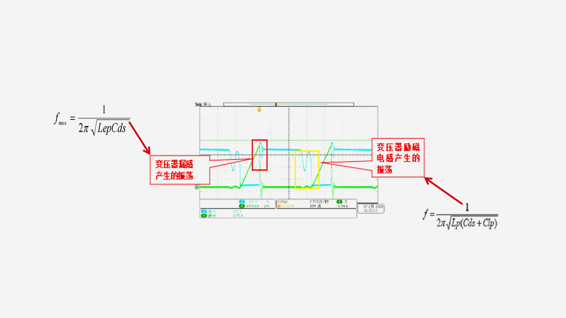 从电流波形上来看,励磁电感中有一定时间内无电流流过,即反激变压器励磁电感中磁通在一定时间内消失,只有反激变压器原边漏感中存在磁通,励磁电感失去箝位作用,励磁电感感量与开关管D-S极间电容会产生LC振荡,振荡频率由励磁电感感量与开关MOS管D-S极电容共同决定。