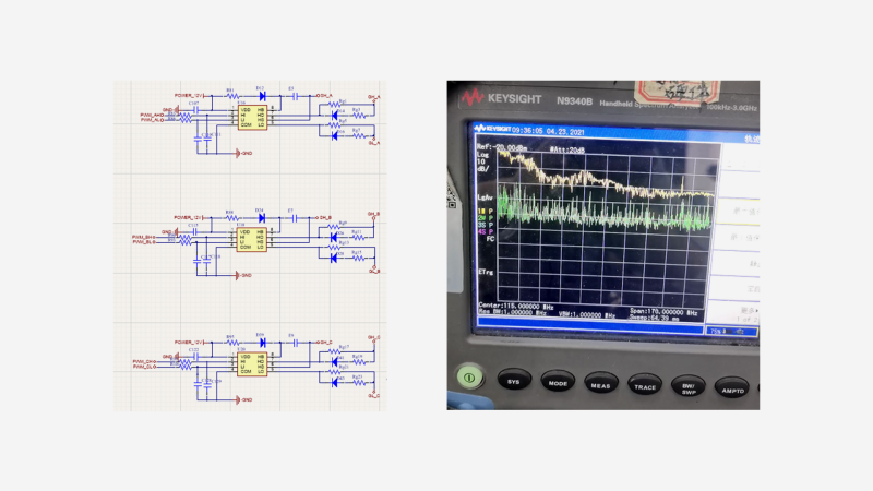 问题解决方案:①在电机驱动IGBT下管增加RC吸收电路;②通过RC吸收电路提供高频噪声的旁路,缩小信号环路面积;③在电机驱动输出信号线缆上增加三线共模电感、在AC输入端增加共模电感、磁环均可。