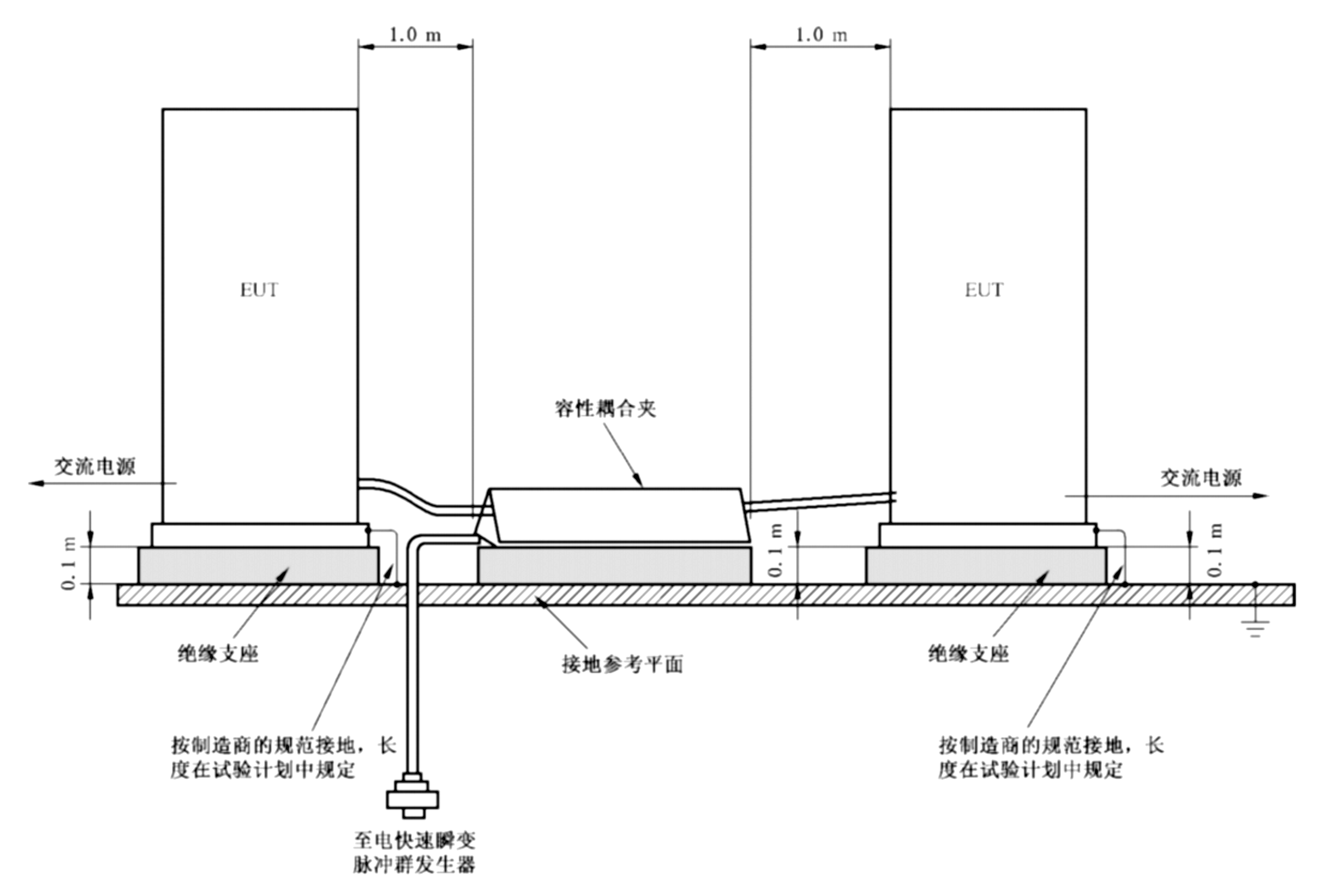 与受试设备相连接的所有电缆应放置在接地参考平面上方0.1m的绝缘支撑上。不经受电快速瞬变脉冲的电缆布线应尽量远离受试电缆,以使电缆间的耦合最小化。