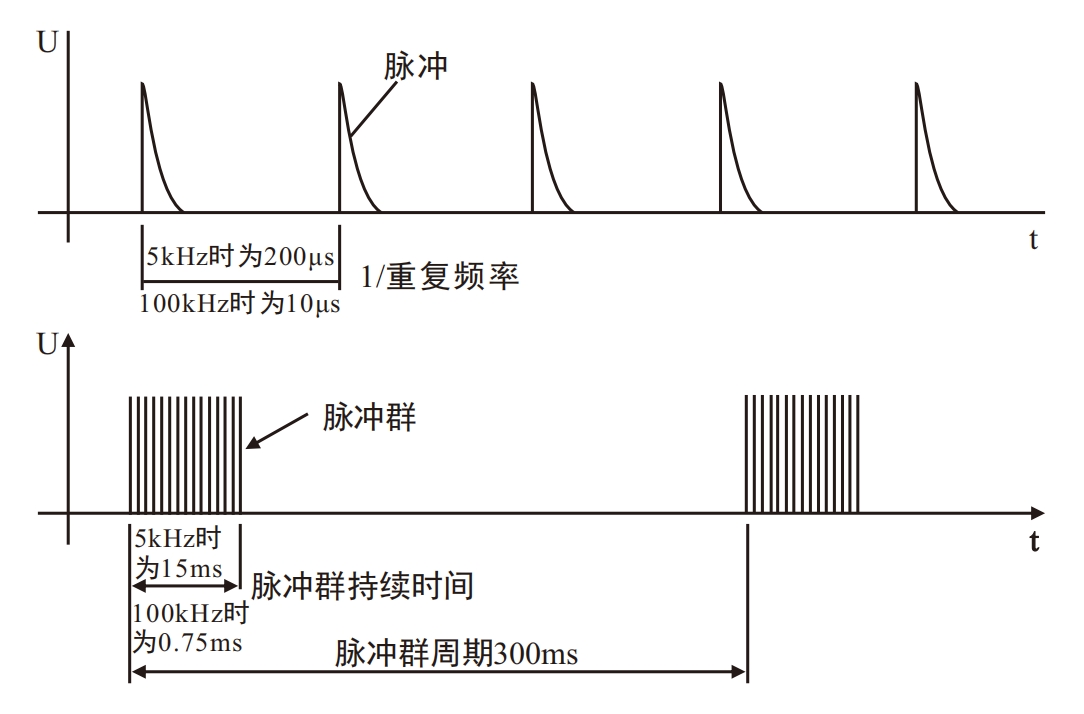 脉冲的重复频率和输出电压的峰值:0.125Kv时为5(1±20%)kHz、0.25kV时为5(1±20%)kHz、0.5kV时为5(1±20%)kHz、1.0kV时为5(1±20%)kHz、2.0kV时为2.5(1±20%)kHz。